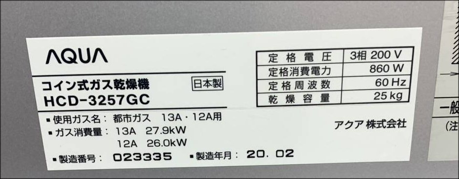ハイアールアクア 25k コイン式ガス乾燥機 都市ガス13A