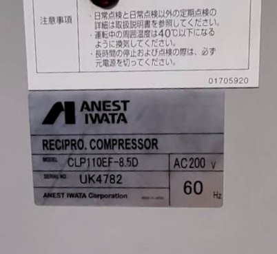 | コメント | 機械寸法:1230×925×1480 450Kg 仕様:https://www.anest-iwata.co.jp/sites/products/files/pim/assets/AE/COMPRESSOR_SPEC/SD_CLP110EF-8.5D_20230928.pdf |