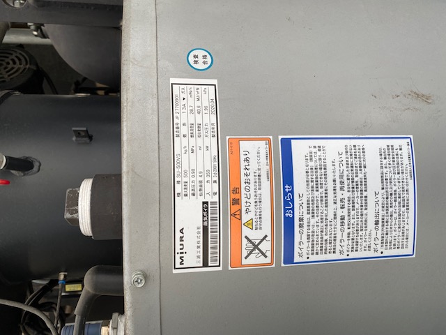 三浦工業製 蒸気ボイラー500Kg(都市ガス13A)